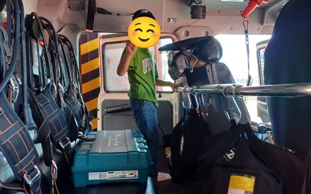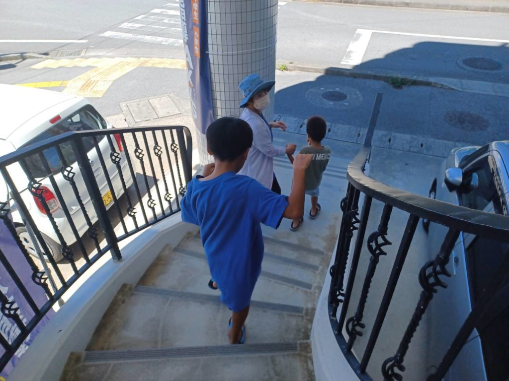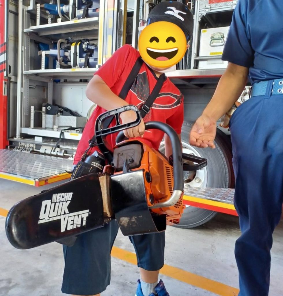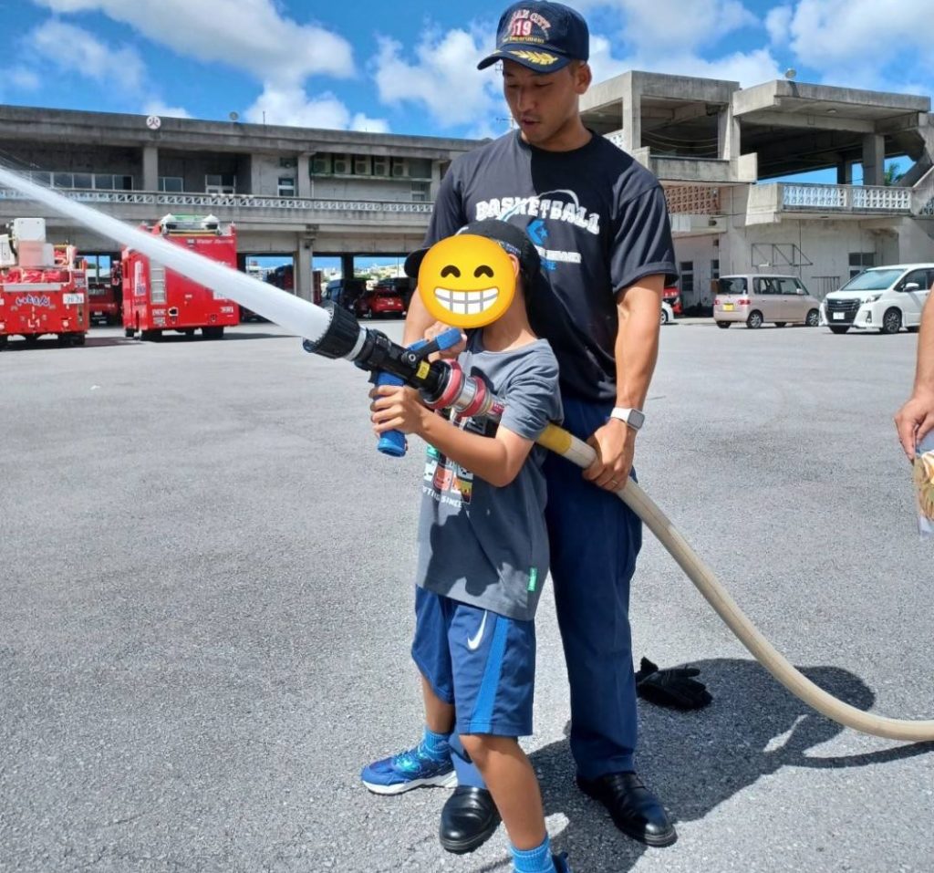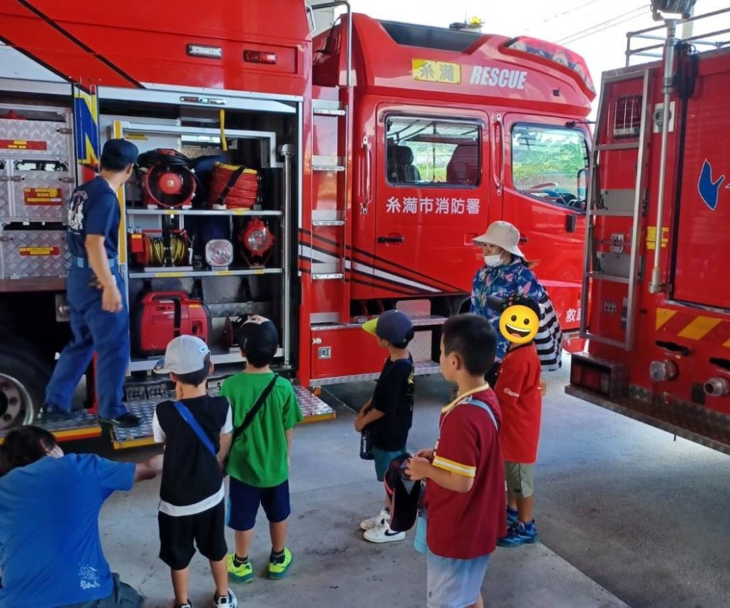 その事前学習として、避難訓練の2日前に子どもたちと糸満消防署へお伺いしました。